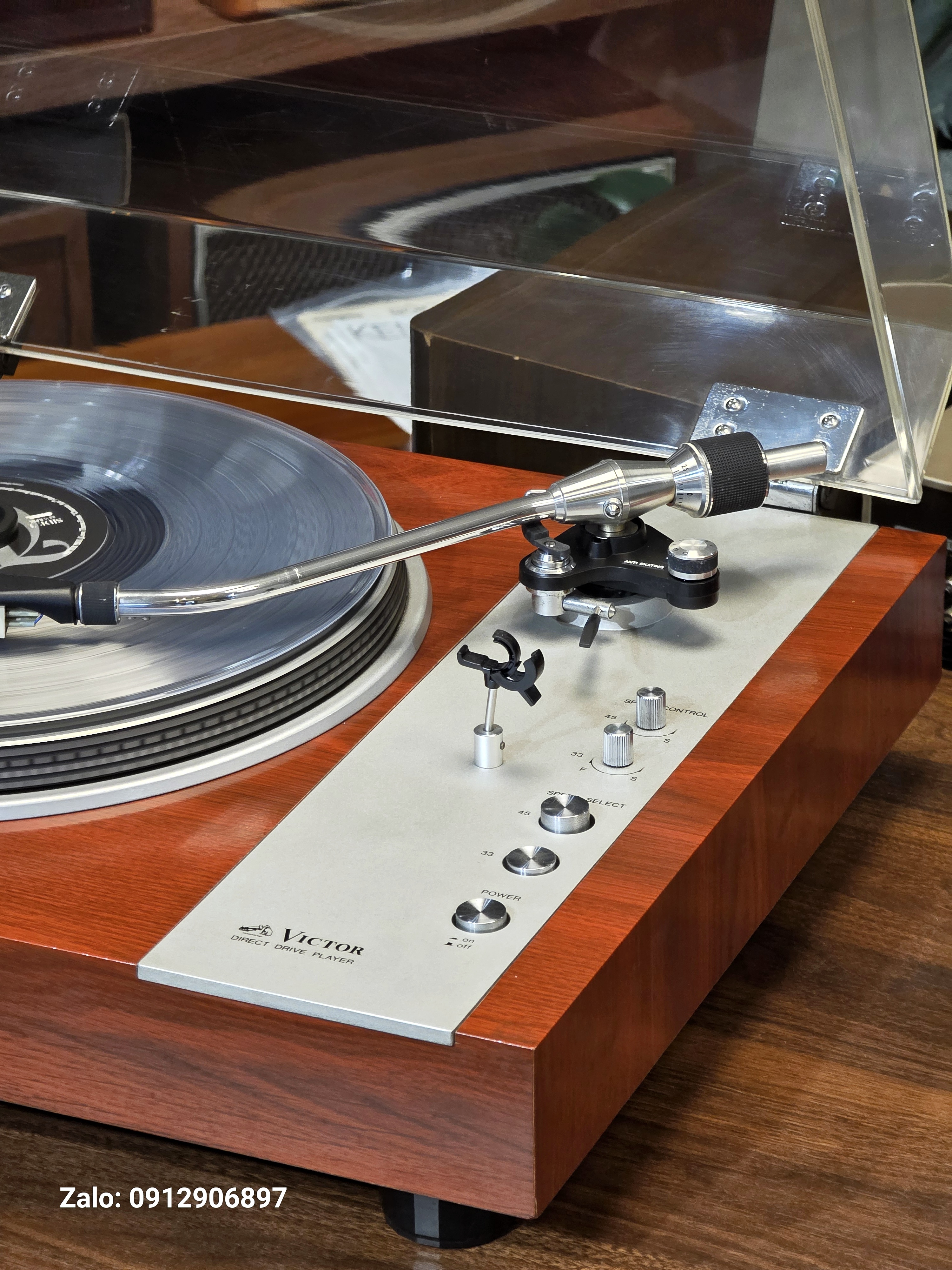 Em ấy ra đời năm 1974, hàng đấu mạng Nhật đẹp zin, nắp mica vẫn còn rất mới. Máy canh tay hoàn toàn, vành băm và bộ cần dài đẹp ghê gớm. Vỏ gỗ lạng rất nặng và đầm tay, phủ một màu cam đỏ rực rỡ. Kim máng Victor nguyên bản cho âm thanh cực kì sắc bén.